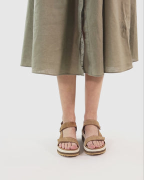 Wedge sandals. Natural suede. Velcro Closure. Leather lining. Anatomical insole. Flexible and durable Polyurethane sole. Heel height: 7.25 cm. 100% Made in Spain.