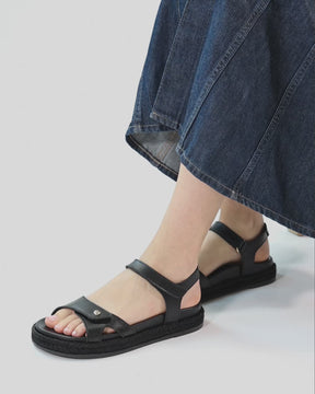 Flat woman's sandals. Black Napa Leather. Velcro Closure. Leather lining. Anatomical insole. Flexible and durable Polyurethane sole. Heel height: 4.5 cm. 100% Made in Spain.