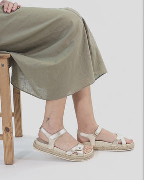 Flat woman's sandals. Gold nappa leather. Velcro Closure. Leather lining. Anatomical insole. Flexible and durable Polyurethane sole. Heel height: 4.5 cm. 100% Made in Spain.