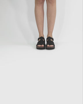 Flat woman's sandals. Black nappa grass leather. Velcro Closure. Leather lining. Anatomical insole. Lightweight, flexible, strong cork and EVA rubber sole. Heel height: 4.5 cm. 100% Made in Spain.